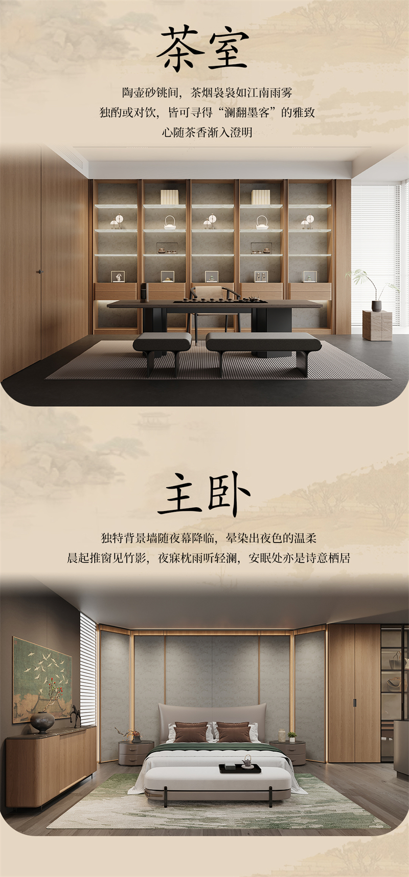 源起“向南窗聽雨,瀾翻墨客”之境,旨在萃取自然意趣與人文風雅的靈韻,匠心獨運地勾勒出靜謐且清幽的居家天地,讓每一寸角落皆氤氳著詩意的寧和,使居者于塵世紛擾中尋得心靈的安謐港灣,沉浸式體悟那份超凡脫俗的居家意境。